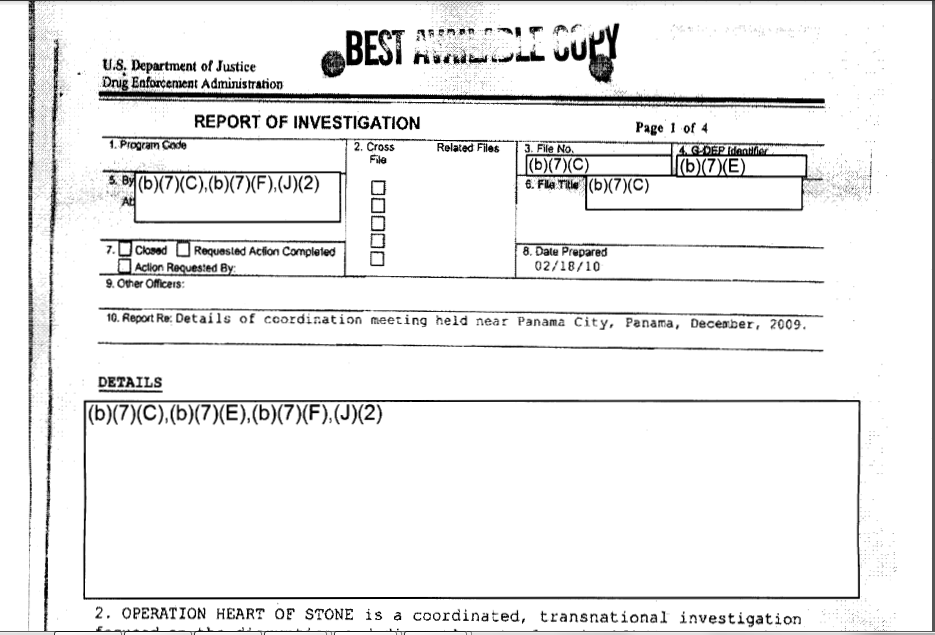 Partindo dessas informações a agência Pública fez em maio um pedido à DEA de todo o material existente sobre a operação “Coração de Pedra”. A agência negou, afirmando que “a busca levaria meses” e “poderia possivelmente interromper as operações normais da DEA”. Pedia que a Pública reduzisse o escopo da busca. Restringimos então a busca aos anos mais relevantes – 2009 e 2010, quando sabíamos que a operação de infiltração estava em andamento, e portanto, documentada em relatórios e evidências resultantes.
