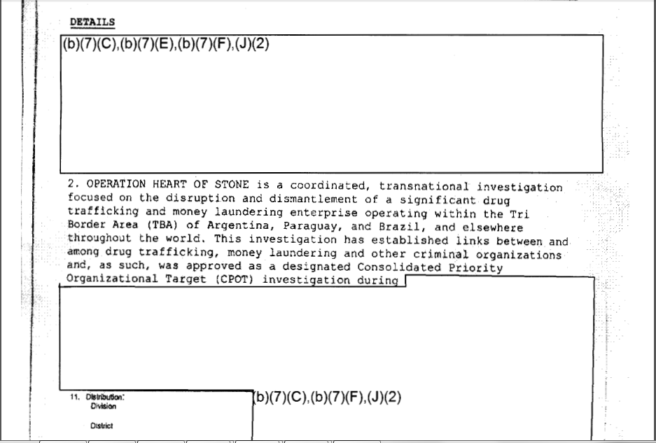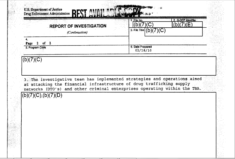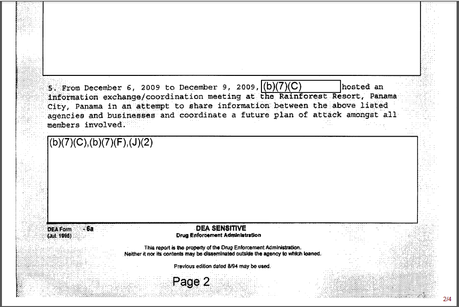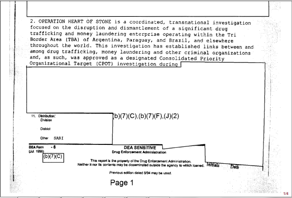 A resposta chegou no final de setembro deste ano. A DEA permitiu a publicação, parcial, do documento de quatro páginas, sendo duas completamente tarjadas pelo risco de “revelar uma fonte confidencial”, “constituir invasão de privacidade privada”, ou “revelar técnicas e procedimentos de investigação policial”. Detalhe: todos esses dados já estão disponíveis na web.