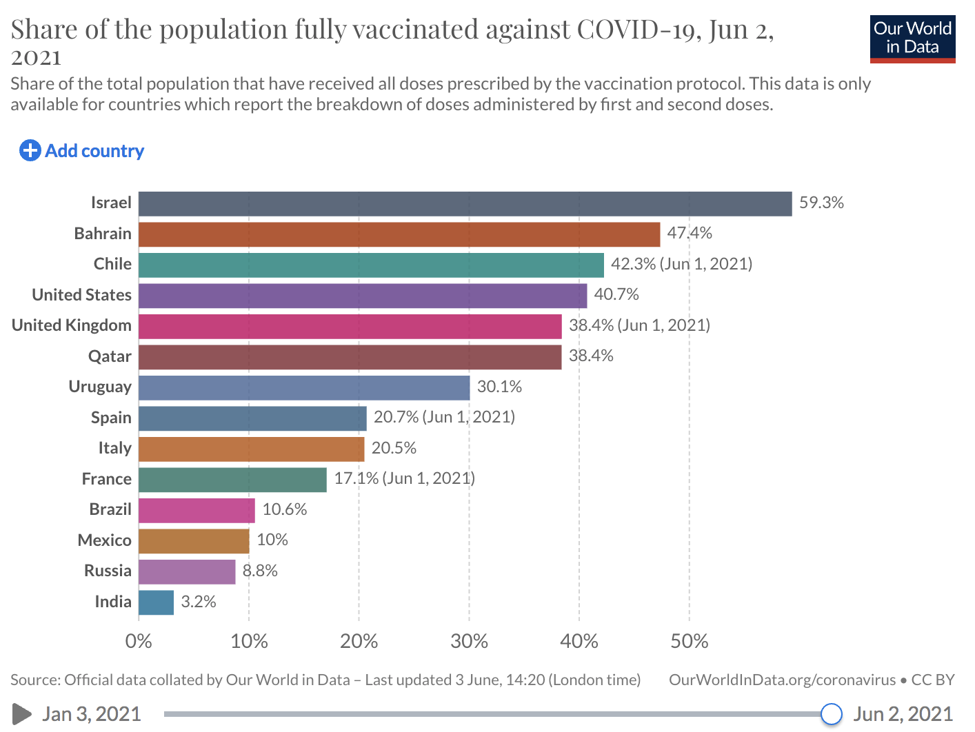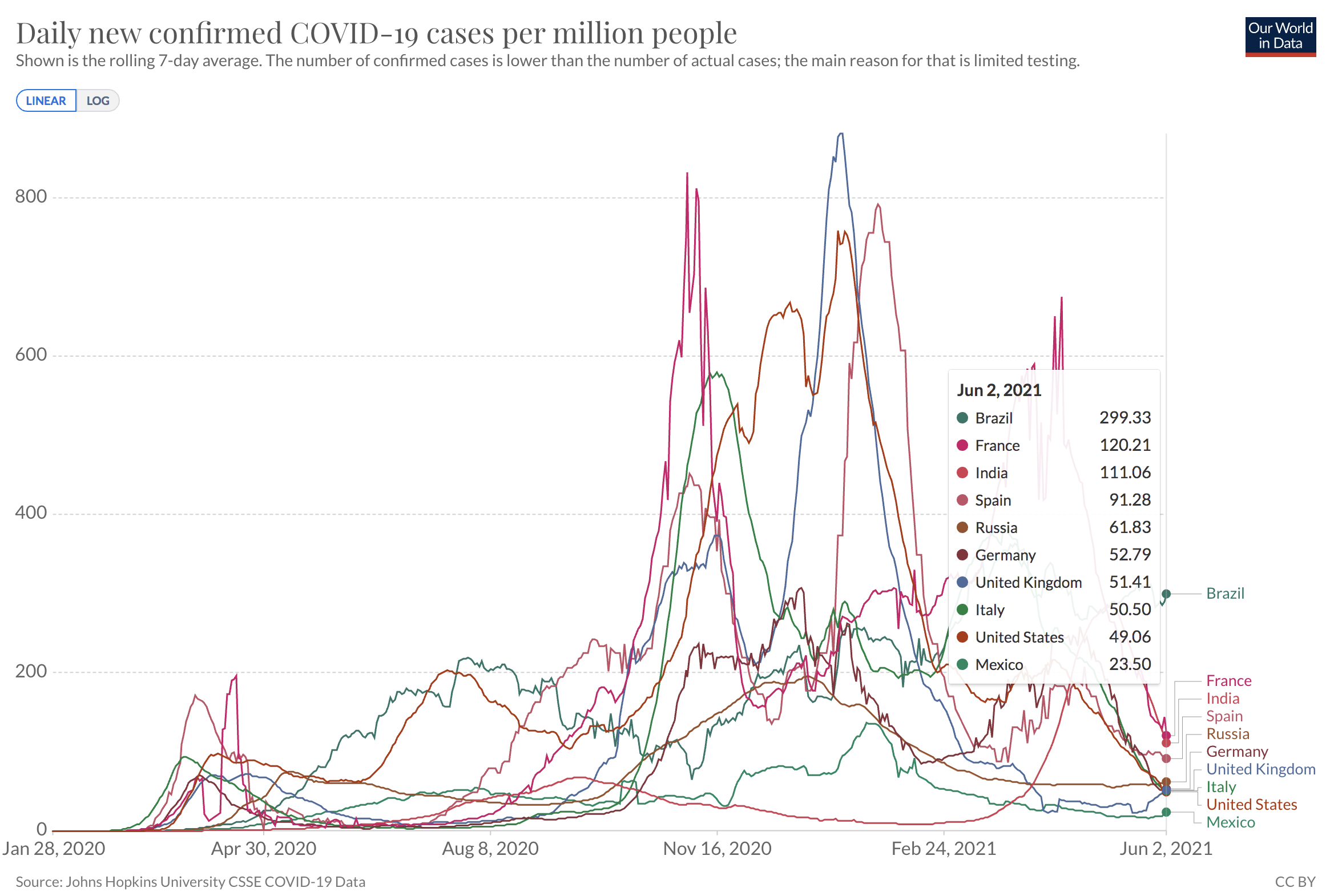 Em 2 de junho, o Brasil tinha 299 casos por milhão de habitantes, mais que o dobro da França e quase três vezes mais que a Índia.