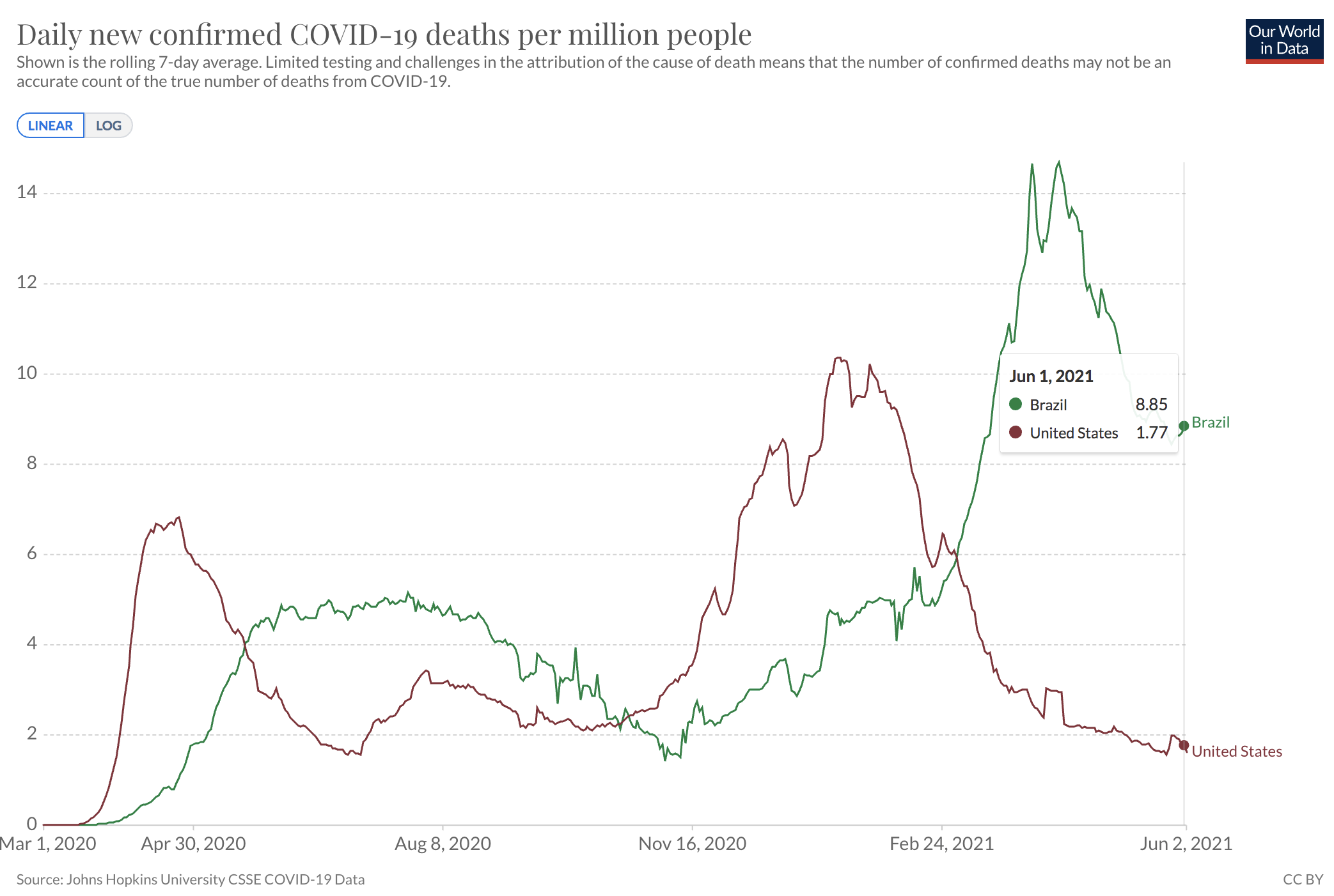 Além disso, o Brasil tem hoje quatro vezes mais mortes por dia que os Estados Unidos.