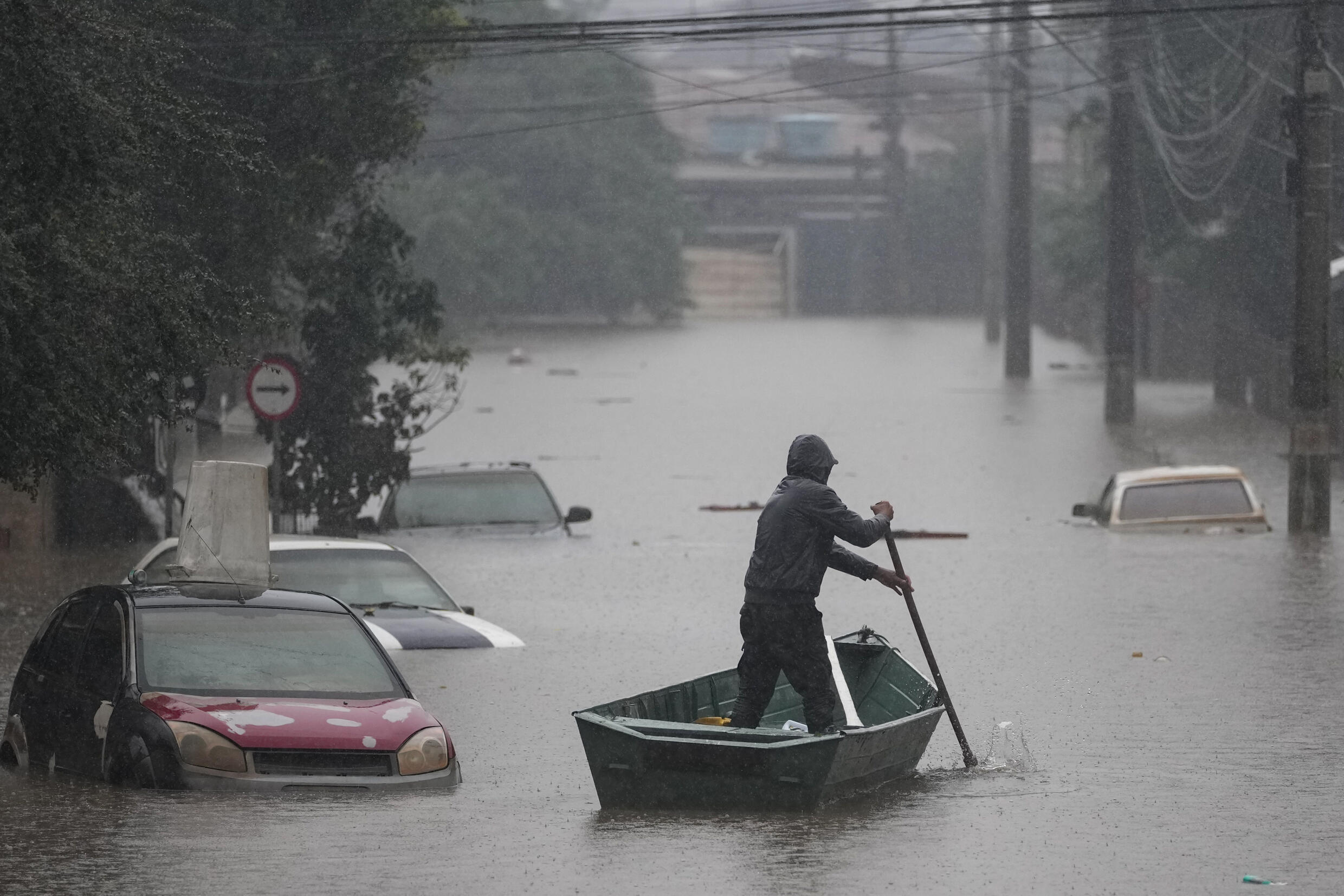 | Homem se locomove de barco pelas ruas de São Leopoldo, no Rio Grande do Sul. (11/05/2024) AP - Andre Penner |
