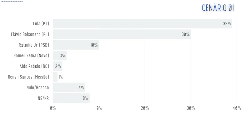 No primeiro cenário, que inclui Flávio Bolsonaro (PL), Ratinho Jr. (PSD), Romeu Zema (Novo), Aldo Rebelo (DC) e Renan Santos (Missão), o atual presidente soma 39% das intenções de voto, abrindo nove pontos de vantagem sobre Flávio Bolsonaro, que aparece com 30%. Ratinho Jr. tem 10%, enquanto os demais ficam abaixo dos 5%.